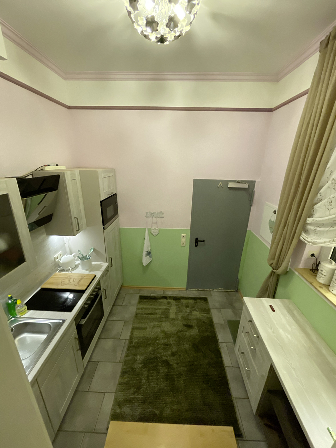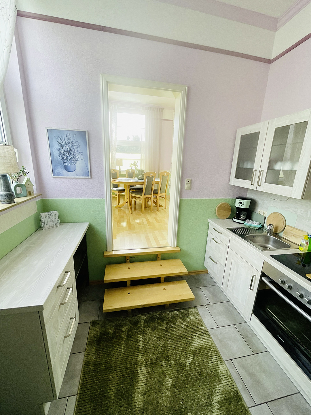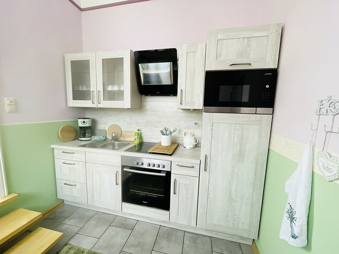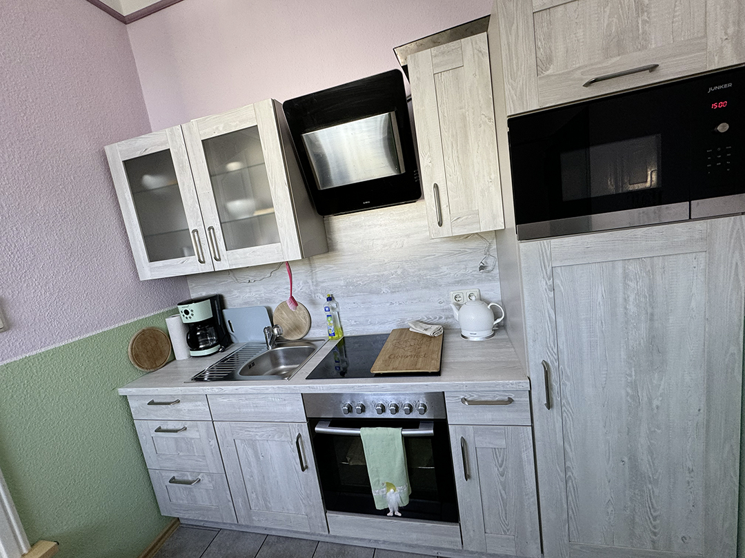 Küche vollausgestattet mit Backofen, Herd, Wasserkocher, Mikrowelle, Kaffeemaschine